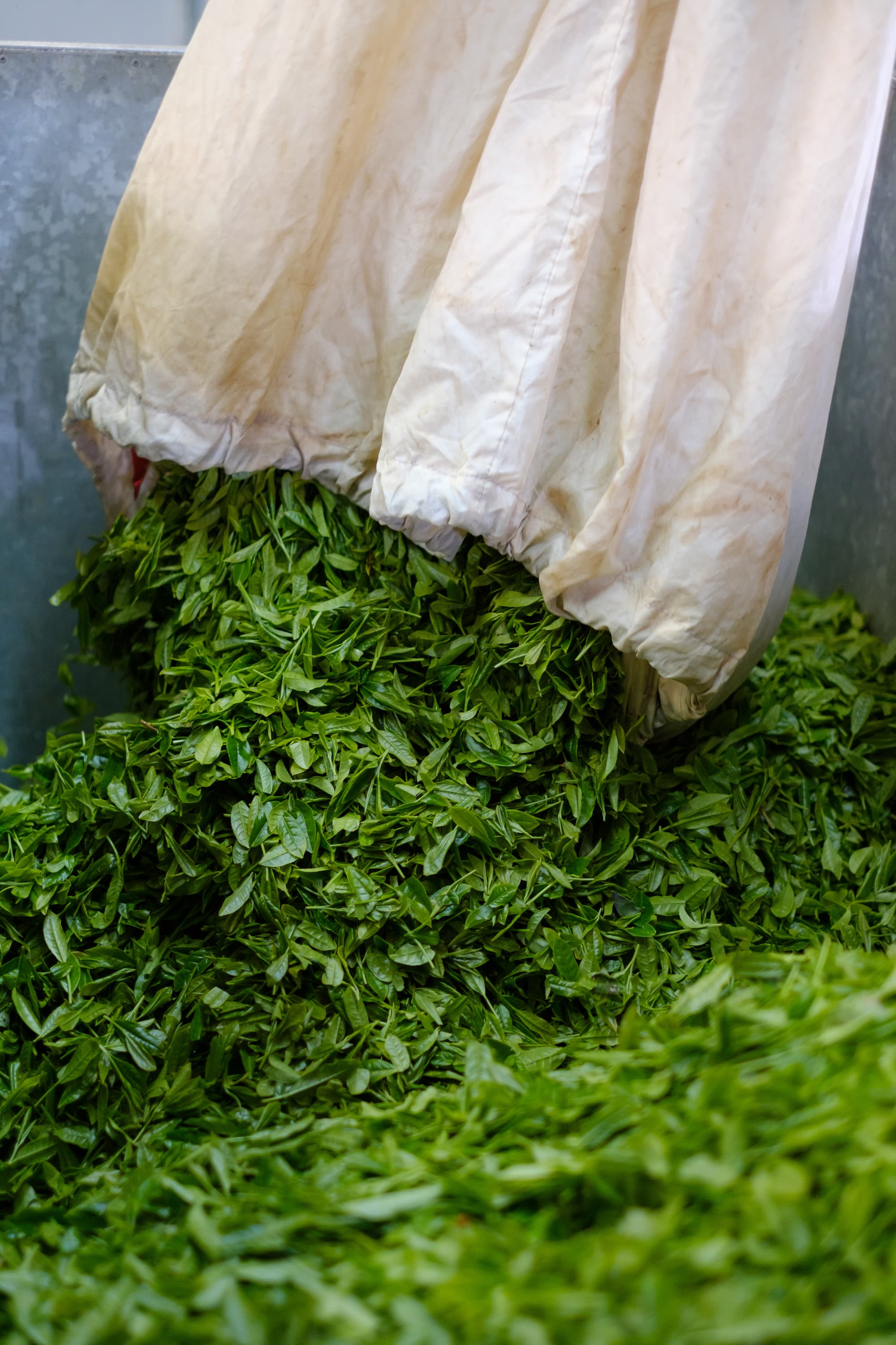 Fresh leaves are steamed within hours to stop oxidation, then dried and carefully de-stemmed and de-veined. The flat flakes created at this stage are called tencha, the raw form of matcha.