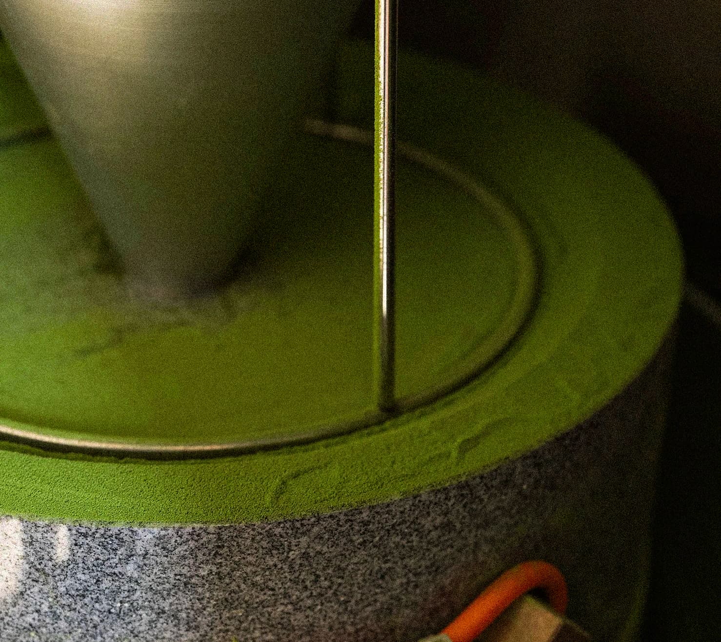 The tencha is refined into matcha using rows of traditional ishi-usu granite mills inside modern tea factories. Each mill grinds only 30–40 grams per hour, which protects the tea from friction heat and preserves its vivid colour, sweet aroma, and nutrients. By operating multiple mills together, producers achieve consistent quality at scale while staying true to centuries-old Japanese techniques.